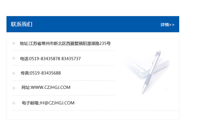 地址:常州市新北區友邦商務大廈1幢16、17層  電話:0519-85101652  傳真:0519-85112595  郵編:213022  網址:www.cz-jiayue_cn.huizhoufw.com  郵箱:xiajifengaa@163.com